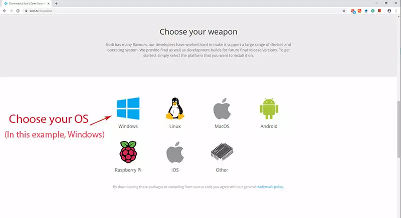 Start by downloading Kodi based on your operating system at https://kodi.tv/download. In this case, we select “Windows